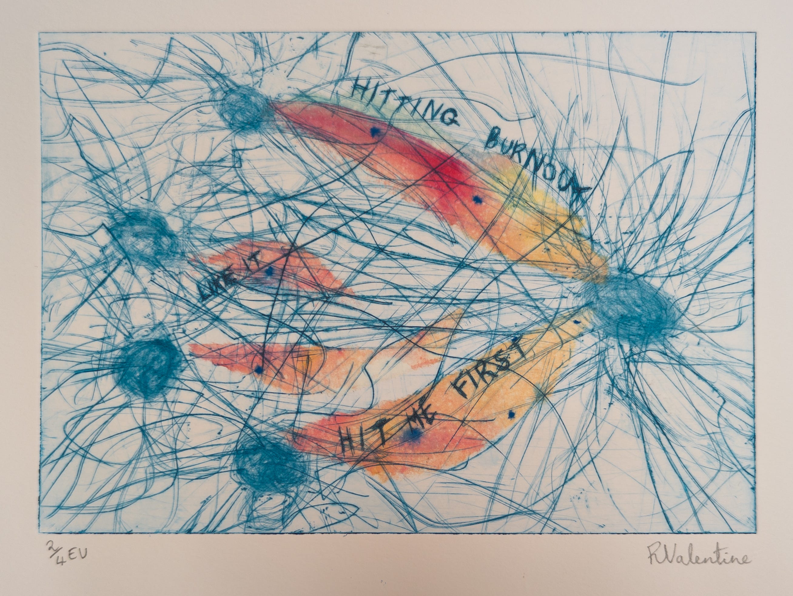 Like most artists, my work is for sale and I’m thrilled when anyone buys it. I’d rather give my art away for a few good meals, or a short stay with someone, but here we are in this post-barter token economy of fixed and measurable value. So, if you would like a Burnout print (there’s a few left from a limited edition of 5, each with different chine colle), feel free to cross my palm with silver, or offer some idiosyncratic trade. I will love you for loving the piece, and we’ll never talk again of that dirty little illusion called money…